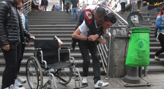 Başkent’in merkezindeki Karanfil Sokak’ta, engelli vatandaşların kullanımı için yapılan asansör çalışmıyor. Bölgeden geçen engelliler, çevredeki esnafın yardımıyla 20 basamaklı ve engelli rampası olmayan merdiveni aşmaya çalışıyor. Her gün onlarca tekerlekli sandalyeli vatandaşa, sırtlarında taşıyarak yardımcı olduklarını belirten Karanfil Sokak esnafı, “Asansörün yapımı iki yıl önce tamamlandı ancak o günden bugüne yalnızca bir gün çalıştı” diyor. Doğuştan engelli Oğuz Mucurluoğlu, Karanfil Sokak’tan gün aşırı geçtiğini belirterek şunları söylüyor: