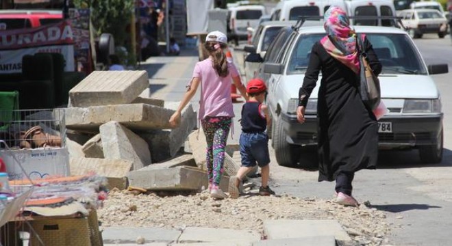 Çalışma kısa sürede tamamlanırken, yerinden sökülüp kenara yığılan bordür taşları yerlerine yerleştirilmedi. Üzerinden 40 gün geçmesine rağmen kaldırımın eski haline getirilmemesi hem esnafa hem de mahalle sakinlerine çile oldu. Trafiğin yoğun olduğu bölgede kaldırımı kullanamadıkları için yoldan yürümek zorunda kalan mahalleli, “Kaldırımın bir kısmına taşları yığıp gittiler. O yüzden ilerleyebilmek için araçların hızla ilerlediği yoldan yürümek zorunda kalıyoruz. Eski haline getirilmesi lazım. Topraktan ya da yoldan yürümek istemiyoruz” ifadelerini kullandı.