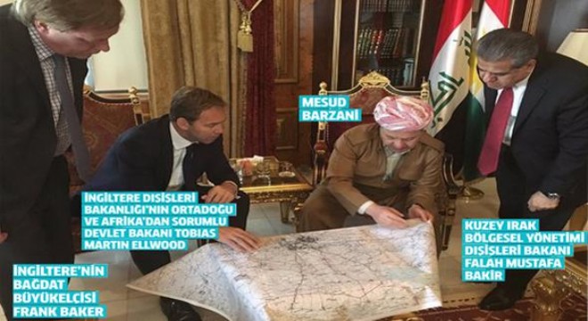 İngiltere Dışişleri Bakanlığı’ndan üst düzey yetkililer 12 Nisan'da Kuzey Irak’ta Mesud Barzani ile “özel” bir görüşme yaptı. Milli Gazete'nin haberine göre Kuzey Irak’taki bağımsızlık referandumu ve DEAŞ'ın konuşulduğu açıklanan toplantıda, masada harita üzerinde yapılan çalışma fotoğraflandı.IBKY Başkanı Mesut Barzani ile görüşen üst düzey İngiliz diplomatların masa başında harita üzerinde çalışırken pozları ortaya çıktı.