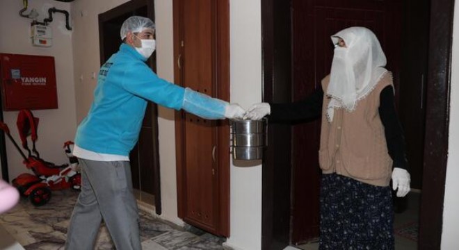 1) Salgın nedeniyle risk grubuna giren vatandaşların evlerine kadar aşevi hizmeti götürülüyor. Üç çeşit yemek sefer taslarına konularak evlere servis ediliyor.