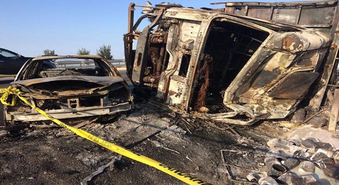 Kaza, bu sabah Bursa-İzmir karayolundaki Karacabey İlçesi yakınlarında bulunan Çingençeşme Mevkii'nde meydana geldi. Balıkesir'den Bursa'ya giden S.M. bilinmeyen nedenle yönetimindeki 34 BFK 23 plakalı boya yüklü kamyonun direksiyon kontrolünü yitirince araç karşı şeride geçip, Karacabey yönüne giden iki otomobilin üstüne devrildi. Kazada, alev alan boyaların yanmaya başladığı kamyonun altında kalan 16 R 1772 plakalı otomobilde bulunan Orhan Tilki ile Tuncay Karaduman yanarak öldü. Kamyon sürücüsünün de yaralandığı kaza ardından alev alan kamyon ve otomobiller itfaiye ekipleri tarafından güçlükle söndürüldü. Plakası alınamayan diğer otomobilde kimsenin yaralanmadığı ifade edildi