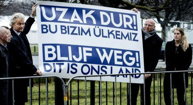 PVV Lideri Geert Wilders, Türkiye’nin Lahey Büyükelçiliği önünde Türkçe ve Hollandaca, “Uzak dur, bu bizim ülkemiz” yazılı pankart açtı. Wilders, gazetecilere yaptığı açıklamada Türkiye’de halk oylamasına sunulan yeni anayasanın cumhurbaşkanına daha fazla güç verdiğini belirterek “Türk bakanların Hollanda’ya gelip bizim ülkemizde böyle bir rejim için lobi yapmasına izin veremeyiz” ifadelerini kullandı.