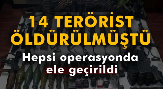 Operasyon kapsamında 12 adet kaleşnikof piyade tüfeği, 1 adet M-16 piyade tüfeği, 1 adet 9 mm Tabanca, 200 gram C4 patlayıcı, 1 adet roketatar, 5 adet M-16 piyade tüfeği şarjörü, 54 adet kaleşnikof piyade tüfeği şarjörü,bin 216 adet kaleşnikof fişeği, 98 adet M-16 piyade tüfeği fişeği, 9 kilogram Amonyum Nitrat, 1 adet EYP kumandası, 4 adet el telsizi, 1 adet büyük telsiz, 2 adet sırt çantası, 100 metre kablo, 9 adet hücum yeleği, 9 adet tüp, 30 litre benzin, 5 adet akü, 1 adet dikiş makinesi, 11 adet şemsiye, 2 adet uyku tulumu ve çok sayıda örgütsel doküman, dijital ile yaşamsal malzeme ele geçirildi.