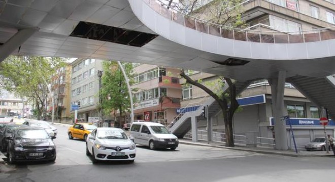 Kızılay Mithatpaşa Caddesi’nde, çürüdüğü için yıkılma tehlikesine karşı kaldırılan 4 ayaklı yaya üst geçidine 200 metre mesafedeki yaya üst geçidinin de demir levhaları dökülmeye başladı.