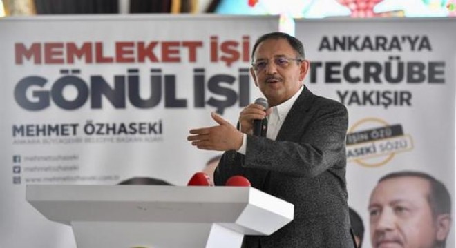 Şimdiye kadar vadettiği bütün projeleri yerine getirdiğini vurgulayan Özhaseki şöyle konuştu: “30-35 yıldır Ankara’daki raylı sistem hattının uzunluğu 60 kilometre civarında. Ben burada, 5 yıl içinde 60 kilometreden fazla raylı sistem yapacağım diye yazdım. Maliyet Ankara Büyükşehir Belediyesi’nin şu andaki bütçesinin 10 yıllık miktarını toplasanız ancak karşılıyor. Benim bulduğum formüller var ama bir taraftan hükümetin desteğinin olması lazım. Sayın Cumhurbaşkanı’mız bu konularda destekleyeceğini söyledi, ben de ona teşekkür ediyorum.” Ankara’da 13 millet bahçesi yapılacağını da hatırlatan Özhaseki, “Bu 13 millet bahçesi tam 12 milyon 960 bin metrekare. Ankara yemyeşil olacak. Bunları yapacağız Allah’ın izniyle” dedi. Günümüzde çocukların evlere hapsolduğuna da dikkat çeken Özhaseki, “1 milyon metrekare alana Çocuk Köyü yapacağız. İçerisinde yüze yakın etkinlik olacak. Çocuklar orada hem geleceğe hazırlanacak hem de eğlenecek” diye konuştu.