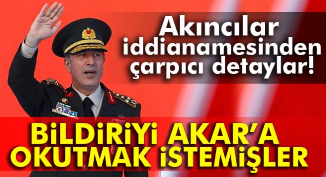 Ankara Başsavcılığı’nca hazırlanan FETÖ’nün 15 Temmuz’da darbe girişiminin üssü olarak kullandığı Akıncılar Üssü’nde yaşananlara ilişkin iddianamenin detayları ortaya çıkıyor. Darbeci askerler, kalkışma gecesi derdest edilerek, Akıncı Üssü’ne getirilen Genelkurmay Başkanı Orgeneral Hulusi Akar’a ikinci bildiriyi okutmaya çalışmış. Akar, kendisinden bildiriyi okuması isteyen darbeci Kuzey Deniz Saha Kurmay Başkanı Tuğamiral Ömer Faruk Harmancık’ı, “Siz deli misiniz, bu devirde böyle şey olur mu?” diyerek reddetmiş. İddianamede Akıncılar Üssü’nde kameraların 19 Haziran itibarıyla kapatılmasından dolayı firari imam Adil Öksüz’ün de kameralara takılmadığı tespit edildi.
