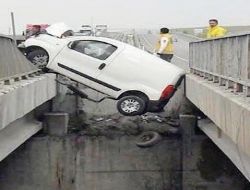 KIRIKKALE yakınlarında sürücüsünün iddiaya göre direksiyon başında uyuması sonucu kontrolden çıkan otomobil önce demir korkuluklara çarptı, ardından da altından 5 metre derinlikte su akan 25 metre yükseklikteki iki köprü arasında asılı kaldı. Kazada, biri ağır, 2 kişi yaralandı.