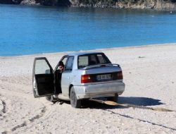 ANKARA / Türkiye Sualtı Federasyonu’ndan belgeli cankurtaran Rıdvan Karatekin, 48 GU 870 plakalı otomobiliyle gezintiye çıktı. Saat 05.00 sıralarında Belcekız Plajı’na gelen Karatekin, bir süre kordonda gezdikten sonra otomobilin yönünü kumsala çevirdi. 100 metrelik kumsalı aşarak deniz kenarına ulaşmaya çalışan Karatekin’in aracı, denize 20 metre kala kuma saplandı. Patinaj yaparak kuma gömülen otomobil, motor kısmının yere temas etmesi sonrası kendiliğinden durdu. Bir daha çalıştıramadığı otomobili kumsalda bırakan Karatekin, günün aydınlanmasıyla tekrar aracın başına döndü. Ankaralı olduğunu, fakat 15 yıldır Fethiye’de yaşadığını anlatan Karatekin, “Çekici geldi. Arabayı çıkartıyoruz. Araba çalışmasa da sorun değil. Bize her yer Ankara” dedi. Plajda güneşlenerek olan biteni izleyen İngiliz Caron Stockman ise sürücünün alkollü olabileceğini söyledi. Stockman, otomobili kumsalda ilk kez gördüğünde çok şaşırdığını kaydetti. Karatekin’in otomobili, çekici yardımıyla güçlükle saplandığı kumlardan çıkarılarak götürüldü.ANKARA /