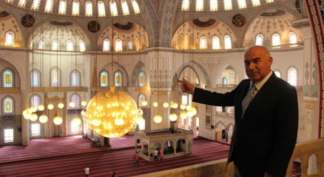 “Cami 1987’de ibadete açıldı. Açılışından önce yani 1985 ya da 1986 yılında takıldığını tahmin ediyorum. Yani yaklaşık 30 yıldır takılı halde. İçinde ve dışında ampul değiştirme işleri yapılıyor. Vinç benzeri bir aletle içine girilerek, zaman zaman içi ve dışı temizleniyor. Tavana bağlı halatlar birbirine karışmış durumda. Eskiden bu çelik halatlar sayılabiliyordu ama zamanla avize dönmüş ve birbirine karışmışlar.
