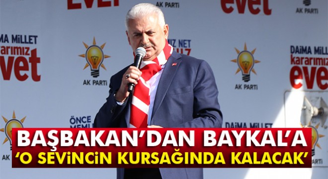 Başbakan Yıldırım, CHP Antalya Milletvekili Deniz Baykal’ın denize dökmüş gibi sevineceğiz sözlerini de eleştirerek, “Birisi de çıkmış diyor ki İzmir’den düşmanı denize dökmüş gibi sevinecekmiş. Sevin sevin, o sevincin kursağında kalacak. İzmir’de ‘evet’ diyecek, Türkiye de ‘evet’ diyecek” ifadelerini kullandı.