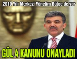 Cumhurbaşkanı Abdullah Gül, 4 kanunu onaylarak yayımlanmak üzere Başbakanlığa gönderdi. Onaylanan kanunlar arasında 2010 Yılı Merkezi Yönetim Bütçe Kanunu da var.