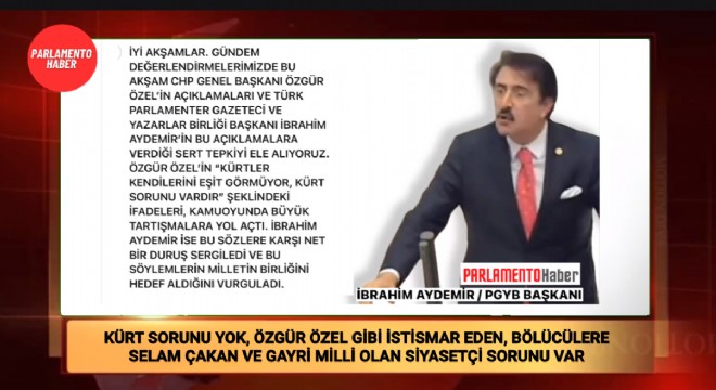 Türk Parlamenter Gazeteci ve Yazarlar Birliği Başkanı İbrahim Aydemir, CHP Genel Başkanı Özgür Özel’in “Kürtler kendilerini eşit görmüyor, Kürt sorunu vardır” şeklindeki açıklamasına sert tepki gösterdi.