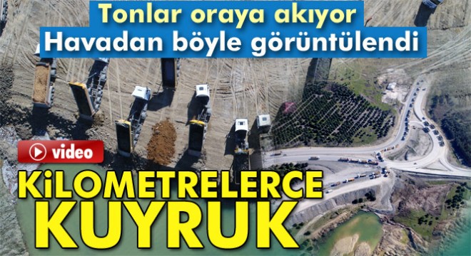 Kilometrelerce hafriyat kamyonu kuyruğu havadan görüntüledi