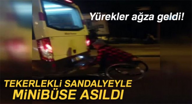 Görüntülerde, tekerlekli sandalyesiyle hızla ilerleyen bir minibüsün arkasına tutunan engelli vatandaşın tehlikeli yolculuğu görülüyor.